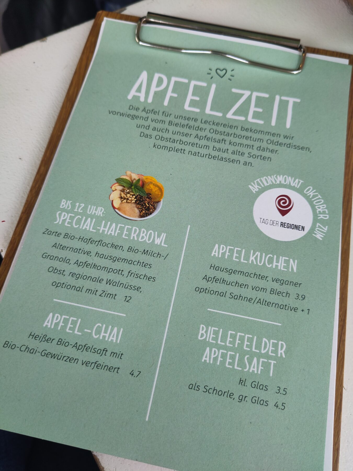 Wer im Oktober durch Bielefeld schlendert, sollte unbedingt einen Stopp bei der HALTESTULLE einlegen. Schon beim Eintreten steigt einem der Duft von frischem Apfelkuchen in die Nase, auf dem Aktionstisch leuchten alte Apfelsorten, und auf der Karte stehen Apfel-Chai und Haferbowl mit Granola, Apfelkompott und regionalen Walnüssen – alles hausgemacht, alles aus der Region.