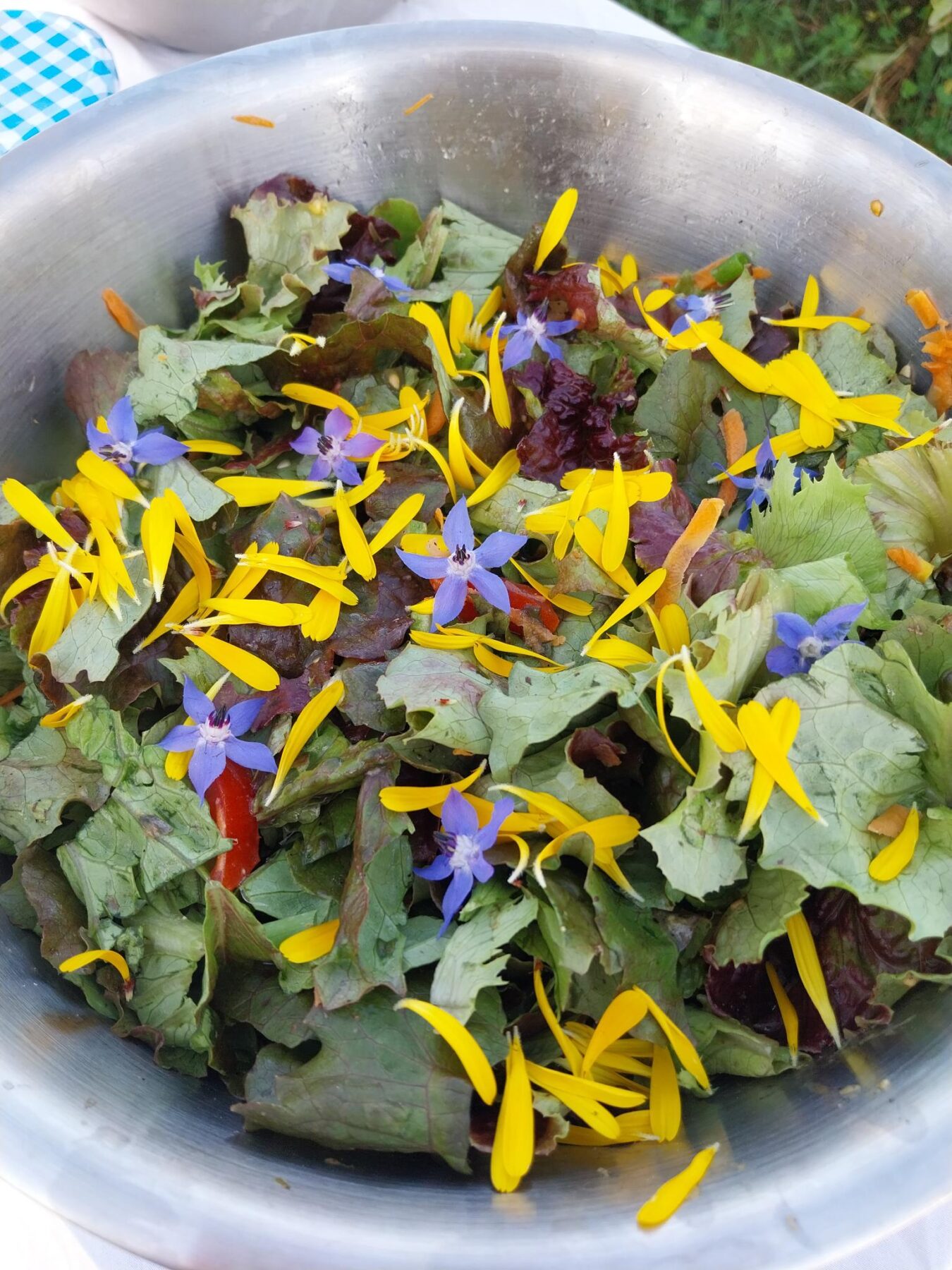 Bereits am Nachmittag um 17 Uhr versammelten sich die ersten Teilnehmenden in unserer Solawi-Küche und auf dem Acker. Direkt auf dem Acker wurden die frischesten Zutaten für den Abend geerntet und zu Salaten veredelt. Was gibt es Schöneres, als Gemüse zu verarbeiten, das noch Erdkrumen an den Wurzeln trägt?