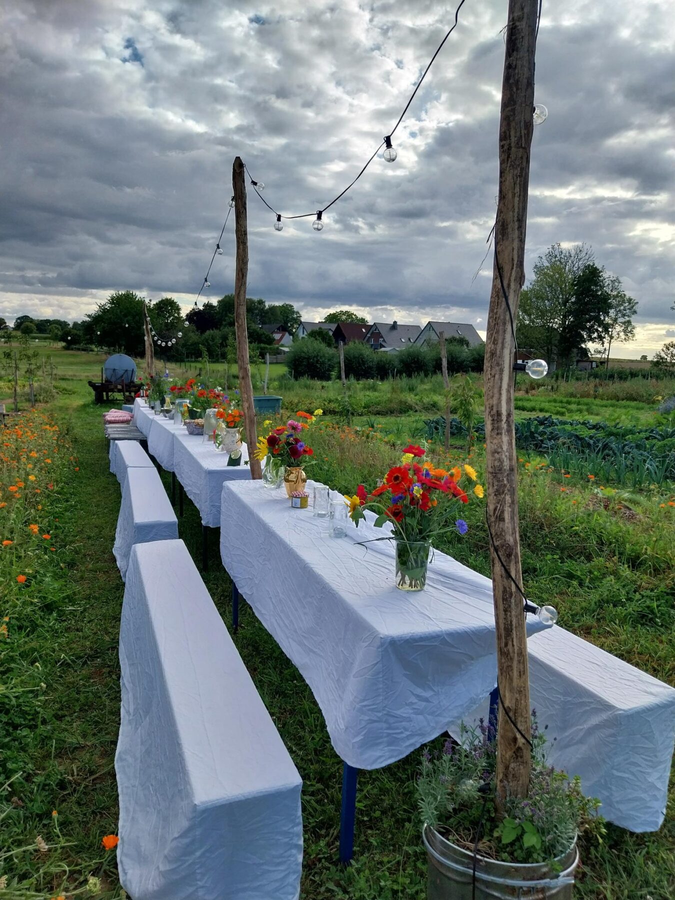 Parallel dazu bereiteten wir für alle Genießer, die ab 19 Uhr dazustoßen wollten, die festliche Tafel vor – mit vielen Blumen vom Acker wurde die lange Tischreihe liebevoll dekoriert, warme Lichterketten gespannt – die Bühne war bereitet für einen besonderen Abend.