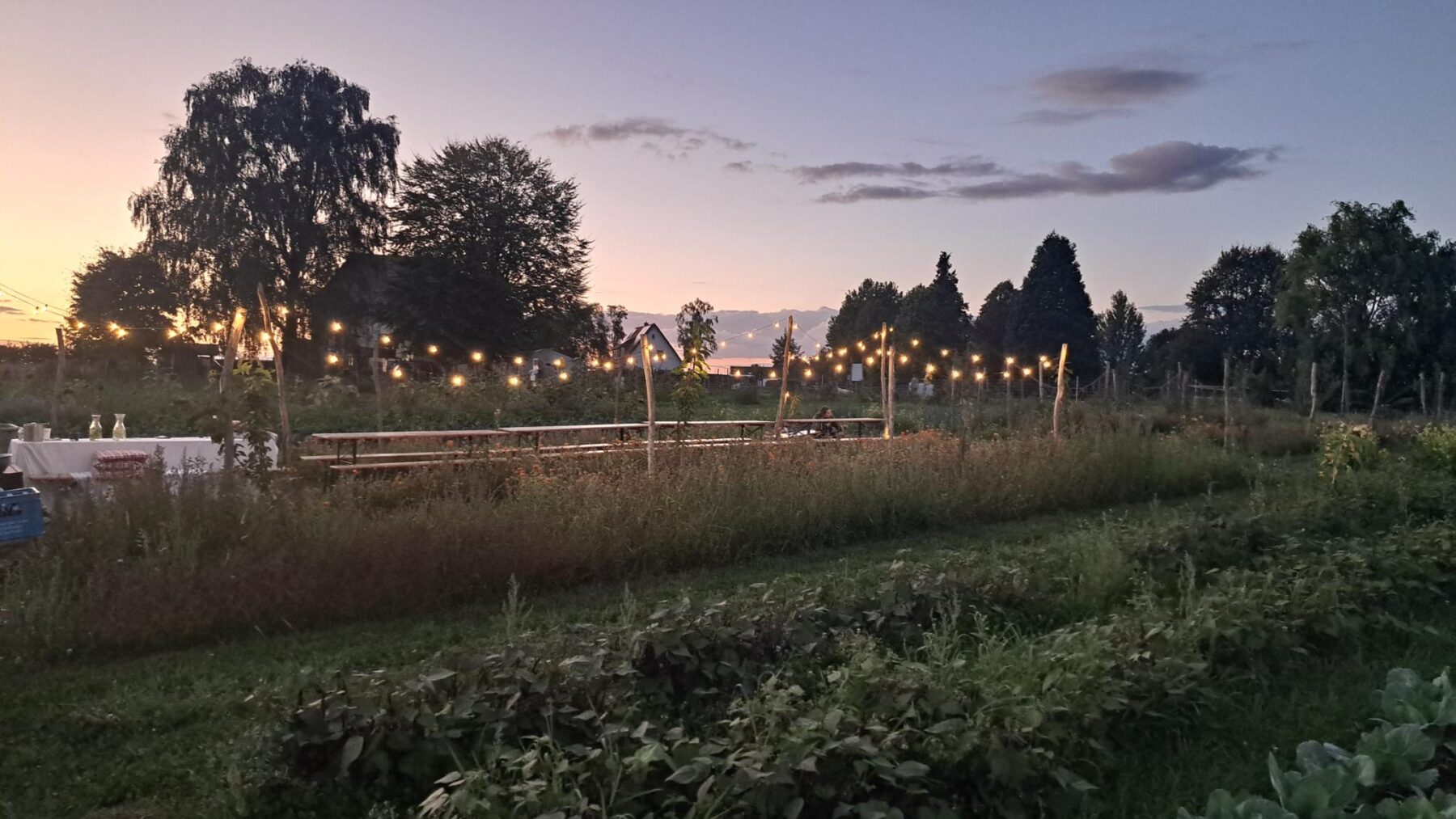 Als sich gegen 19 Uhr alle Teilnehmenden an der langen, festlich gedeckten Tafel versammelten, entstand eine ganz besondere Stimmung. Umgeben von unserem frischen Gemüse und den jungen Bäumen unserer Agroforstpflanzung, unter dem warmen Schein der Lichterketten, wurde deutlich: Hier passiert mehr als nur gemeinsames Essen.