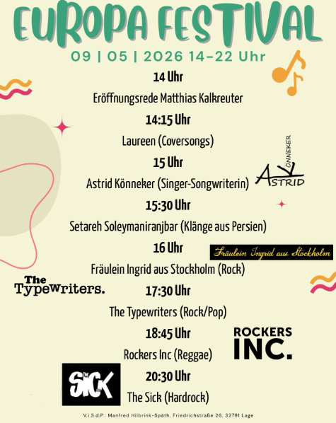 Gemeinsam mit dem DGB, dem kommunalen Integrationszentrum und vielen engagierten Akteur:innen aus der Stadtgesellschaft lädt das Lagenser Bündnis gegen Rechts zu einem kostenfreien Fest ein – für Begegnung, Vielfalt und europäischen Zusammenhalt.