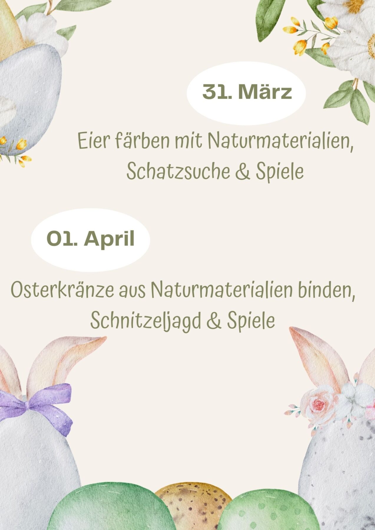 Am 01.04. suchen wir Naturmaterialien, aus denen wir Osterkränze basteln und gehen auf Schnitzeljagd, zwischendurch wird gespielt