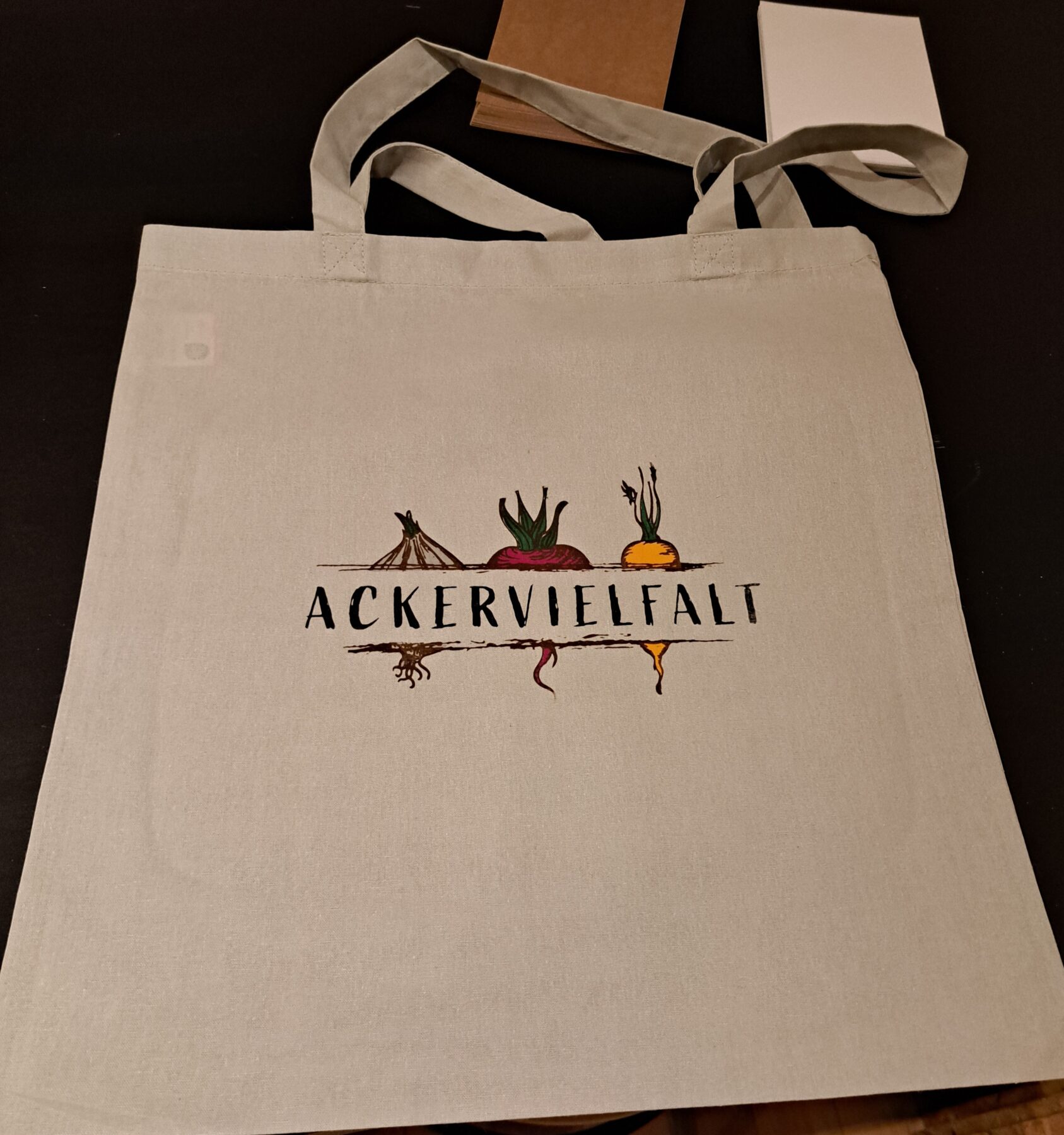 Melanie hatte schon mal eine Tasche mit unserem Logo bedruckt, um die Qualität der Siebe auszuprobieren.
