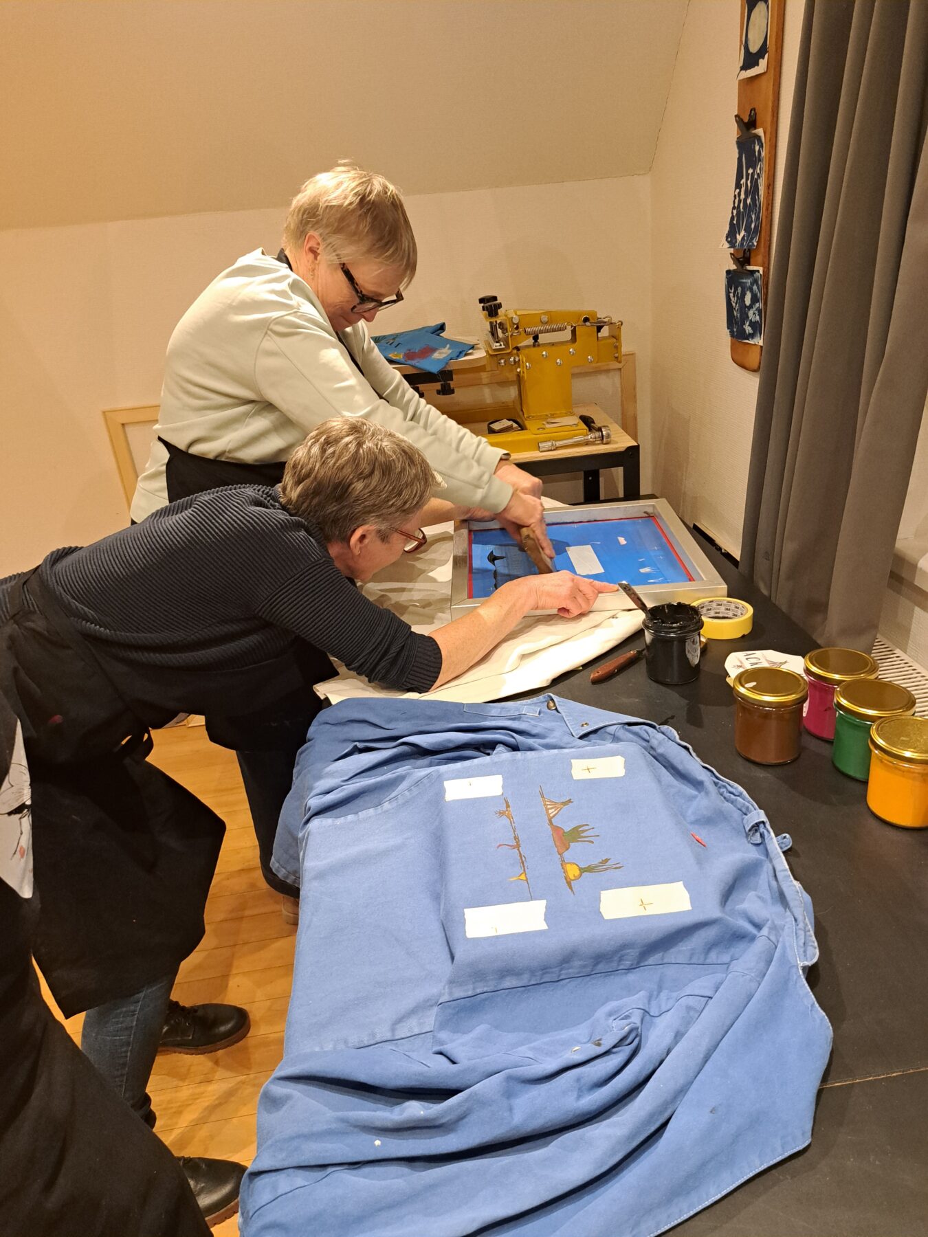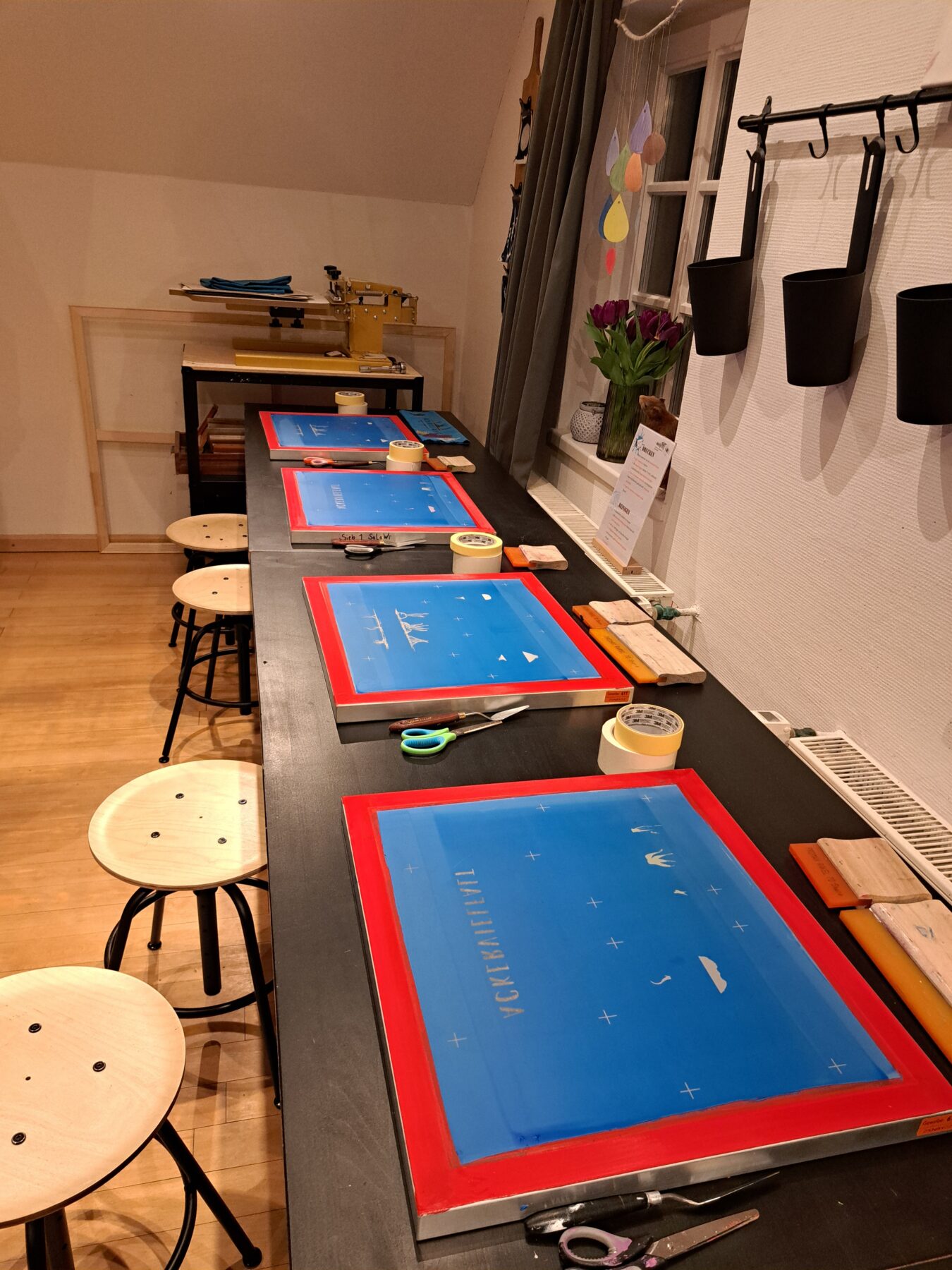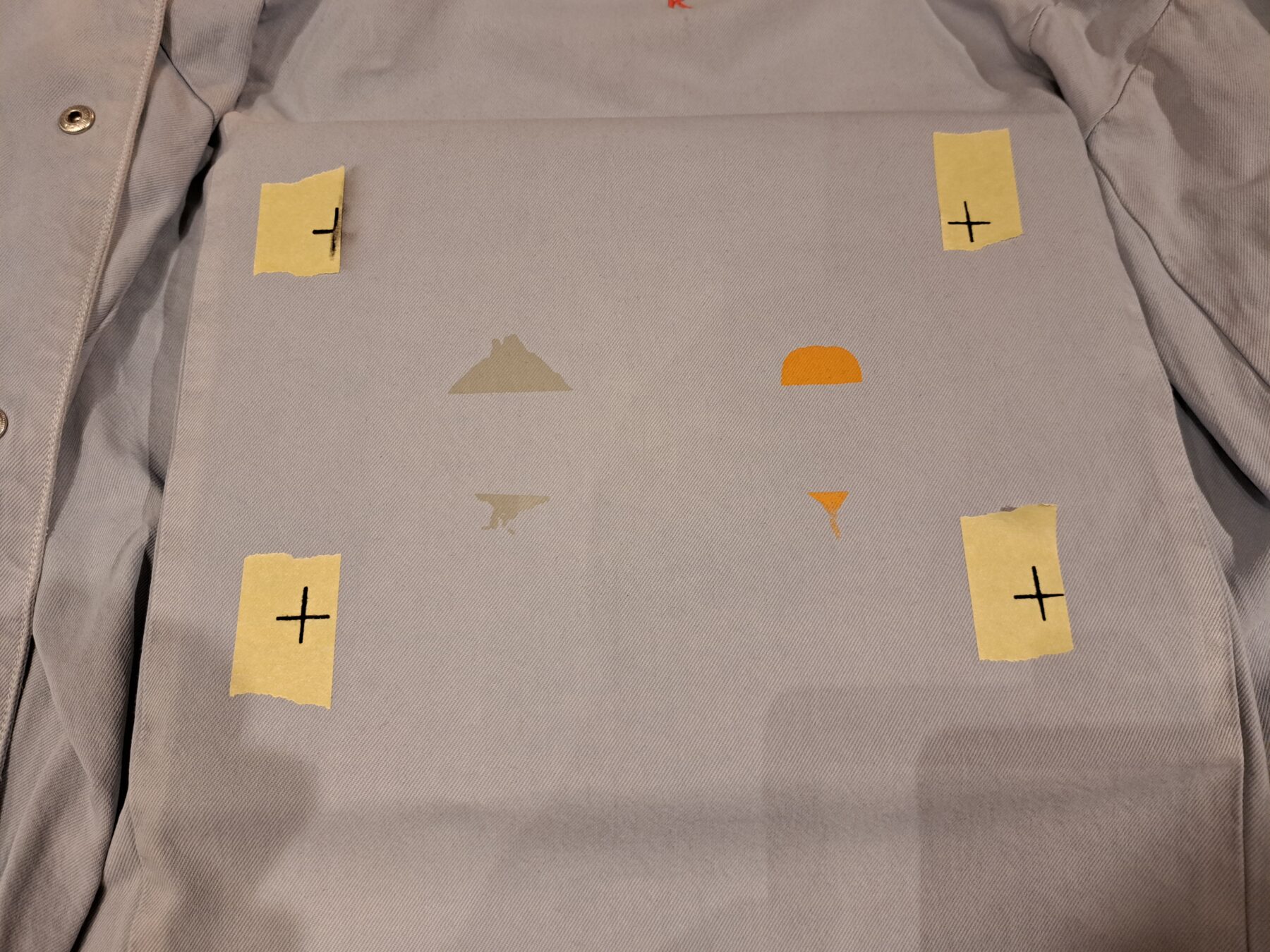 Die zu bedruckenden Textilien mussten erst einmal mit Kreppband beklebt werden, dann mussten die Markierungen der Siebes auf dieses Kreppband übertragen werden. So wurde sichergestellt, dass das Sieb immer an der richtigen Stelle aufgelegt wurde.